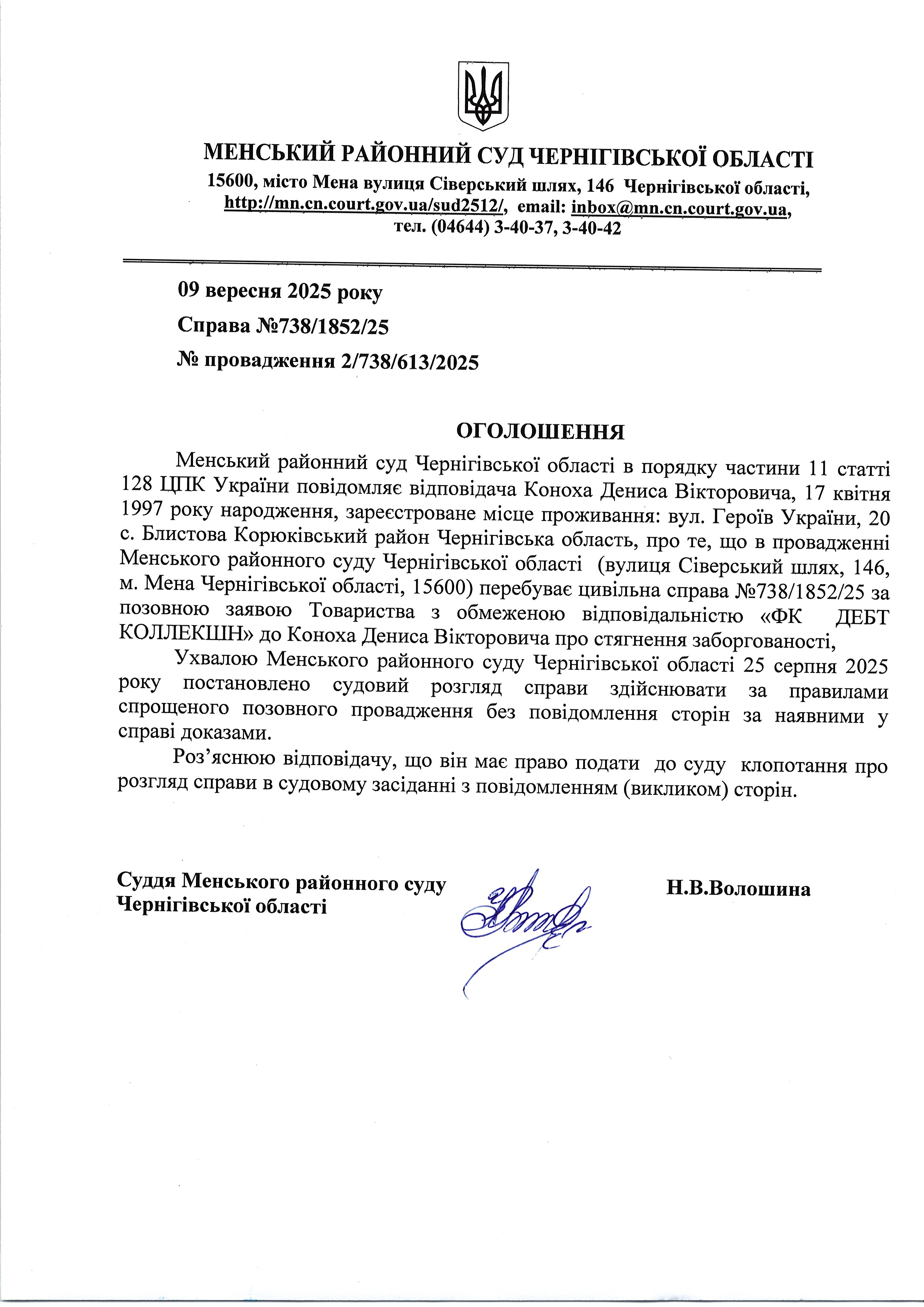 Оголошення про виклик до суду Коноха Дениса Вікторовича