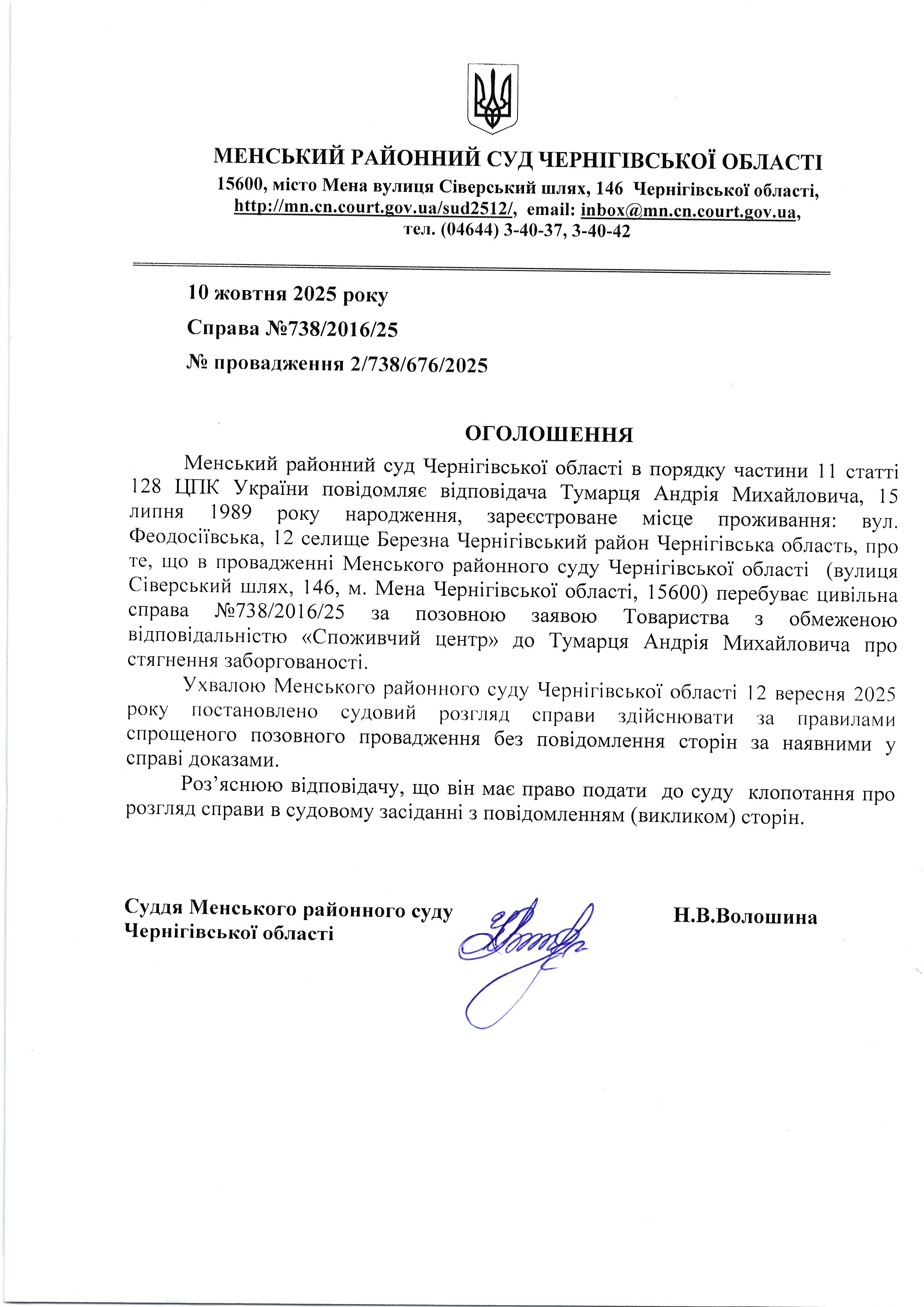 Оголошення про виклик до суду Тумарця Андрія Михайловича