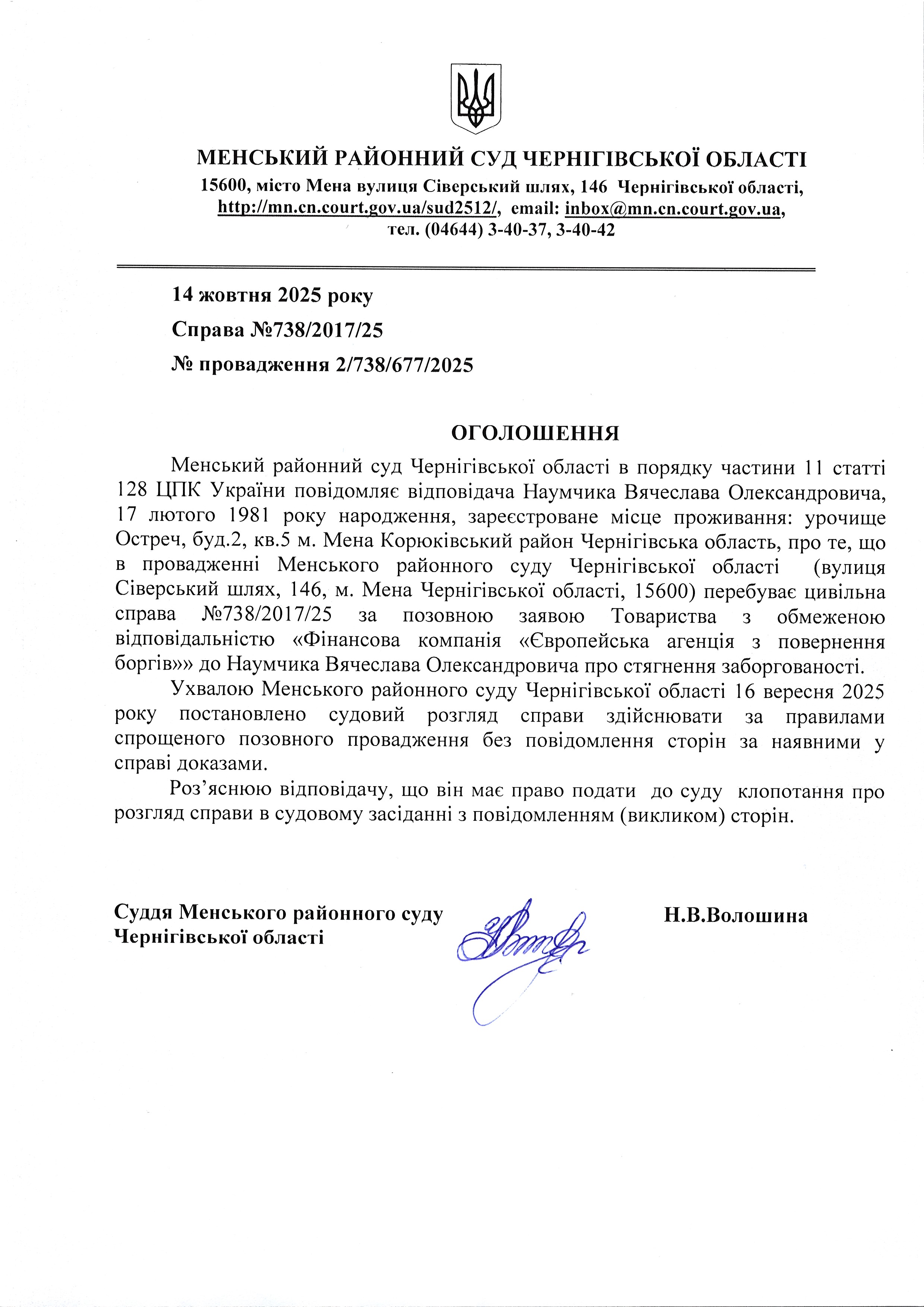 Оголошення про виклик до суду Наумчика Вячеслава Олександровича