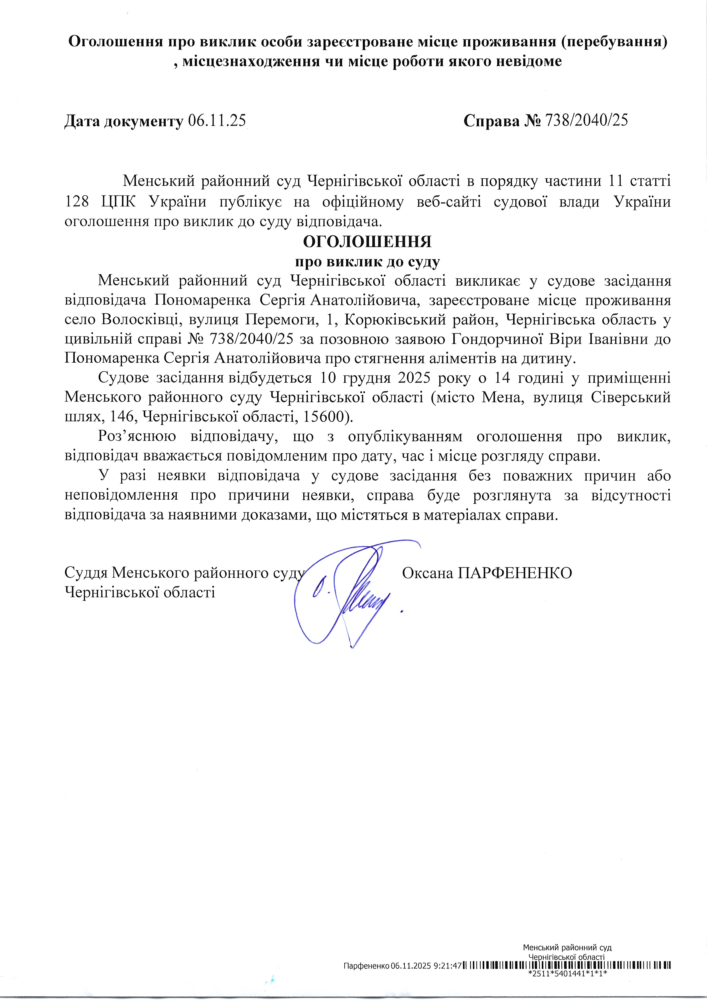Оголошення про виклик до суду Пономаренка Сергія Анатолійовича