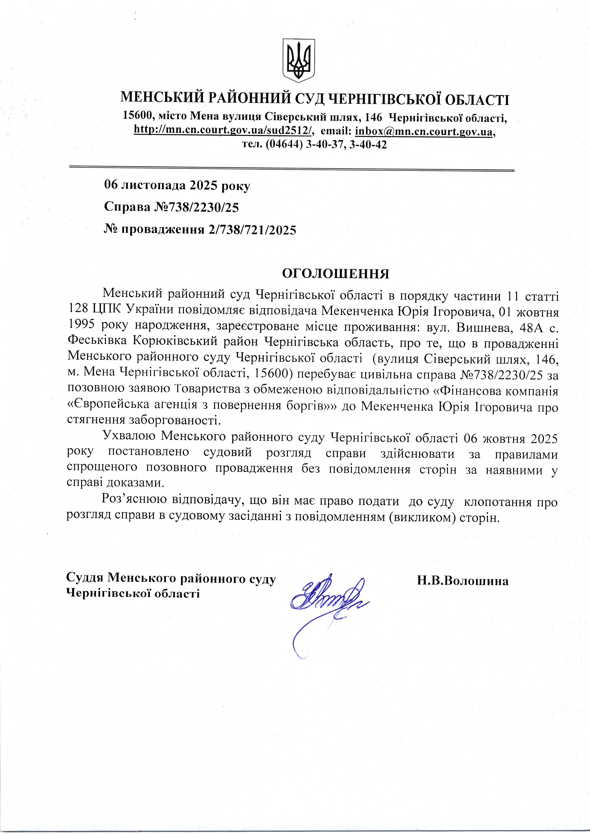 Оголошення про виклик до суду Мекенченка Юрія Григоровича