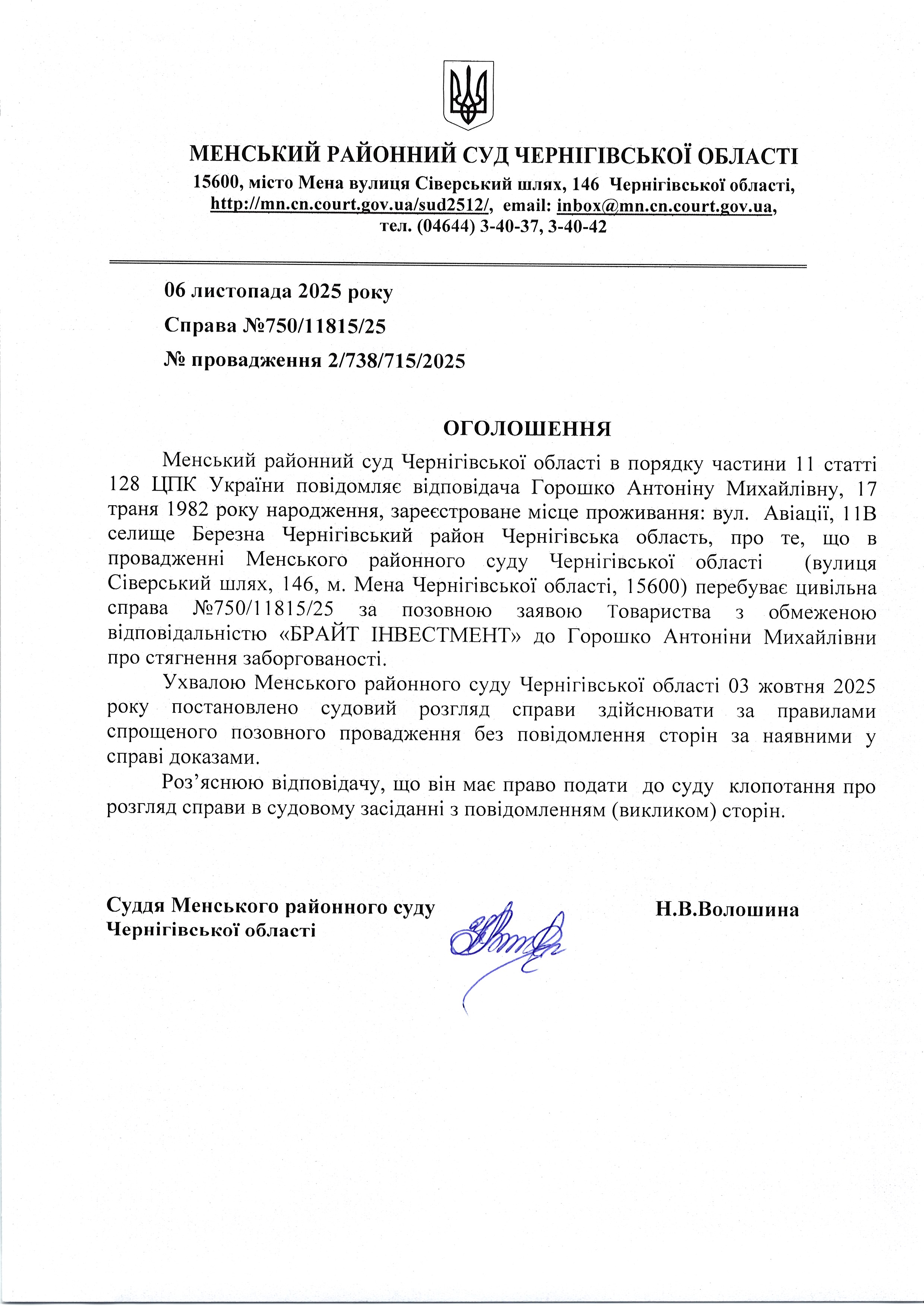 Оголошення про виклик до суду Горошко Антоніну Михайлівну