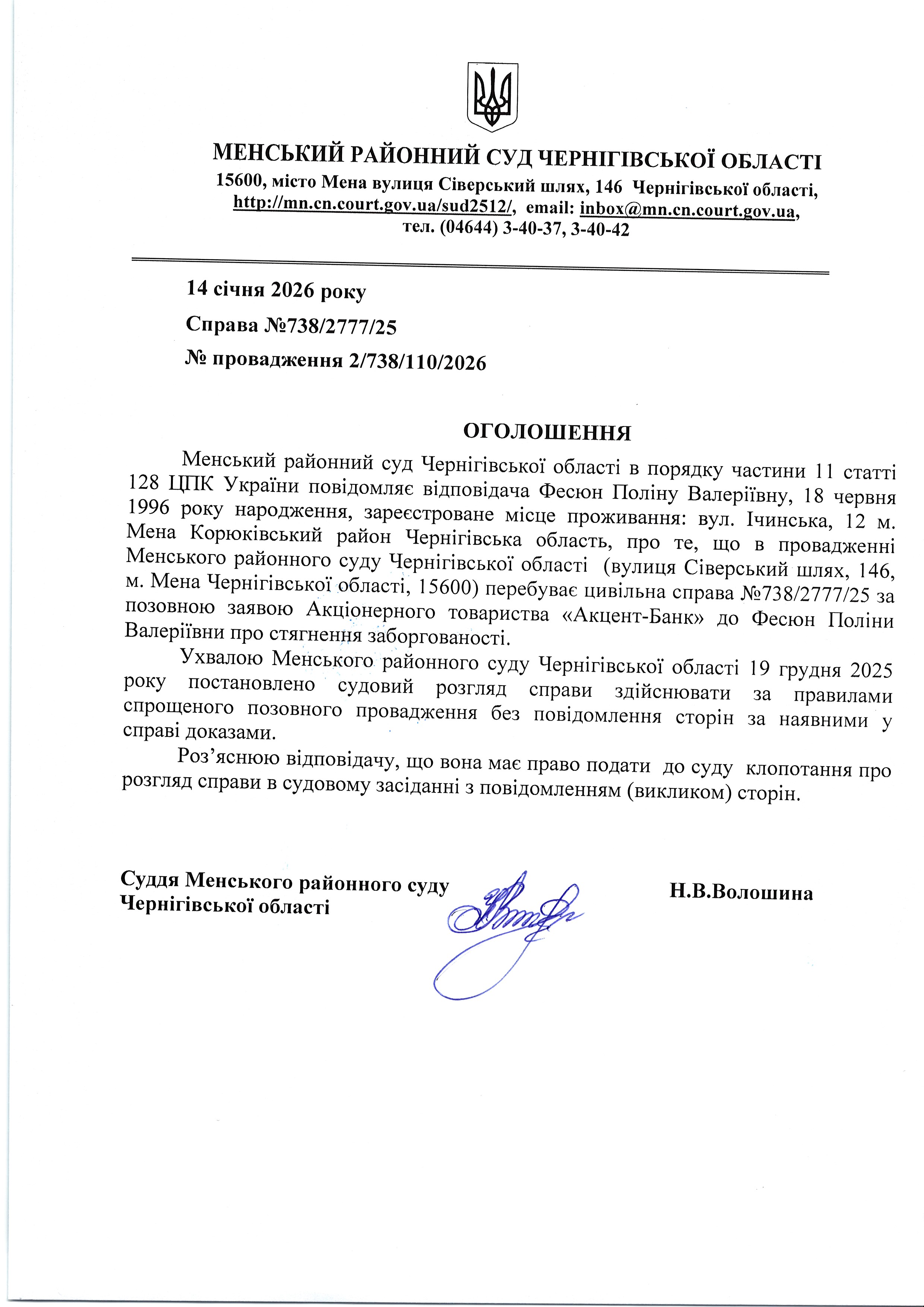 Оголошення про виклик до суду Фесюн Поліну Валеріївну