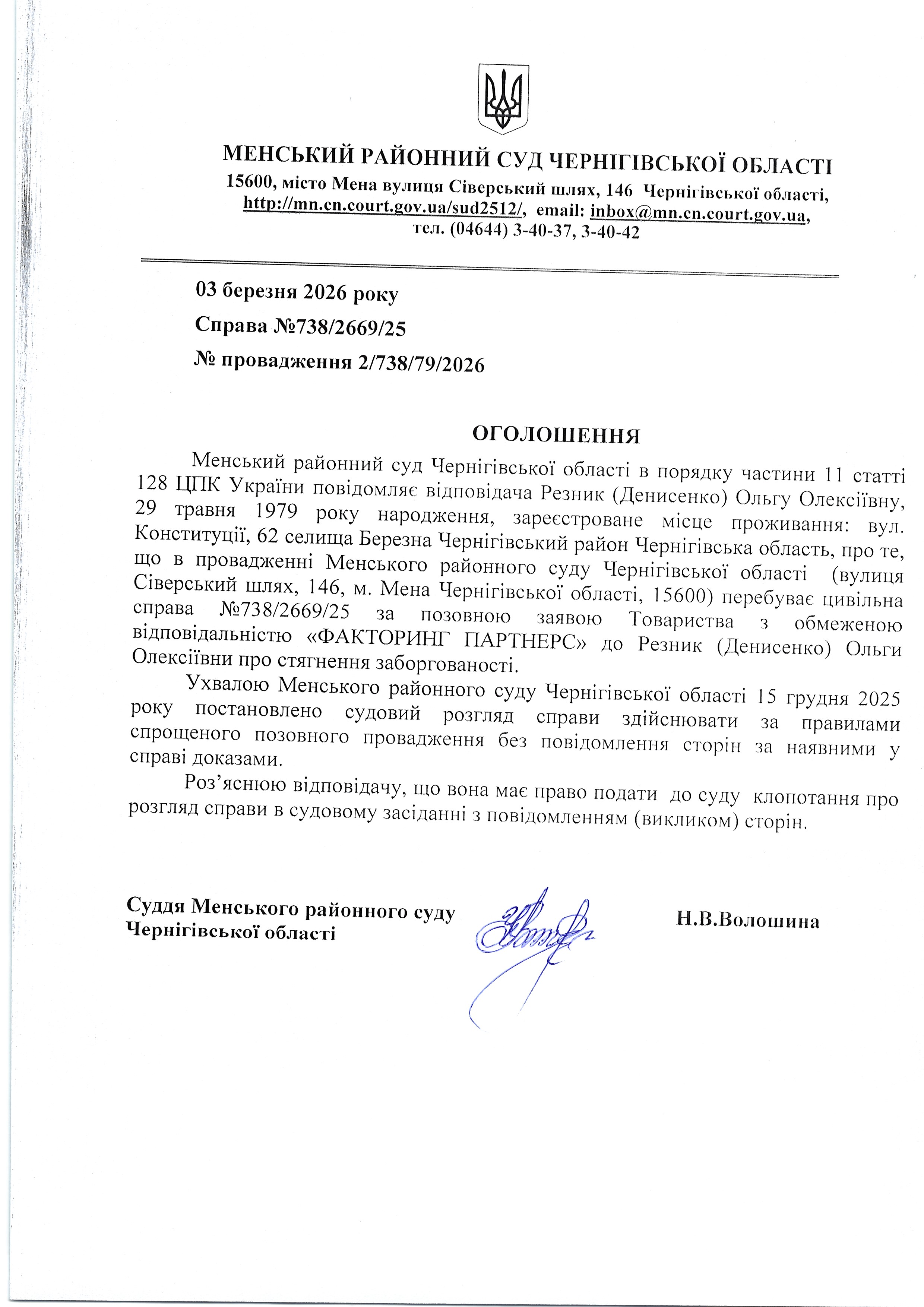 Оголошення про виклик до суду Резник (Денисенко) Ольгу Олексіївну